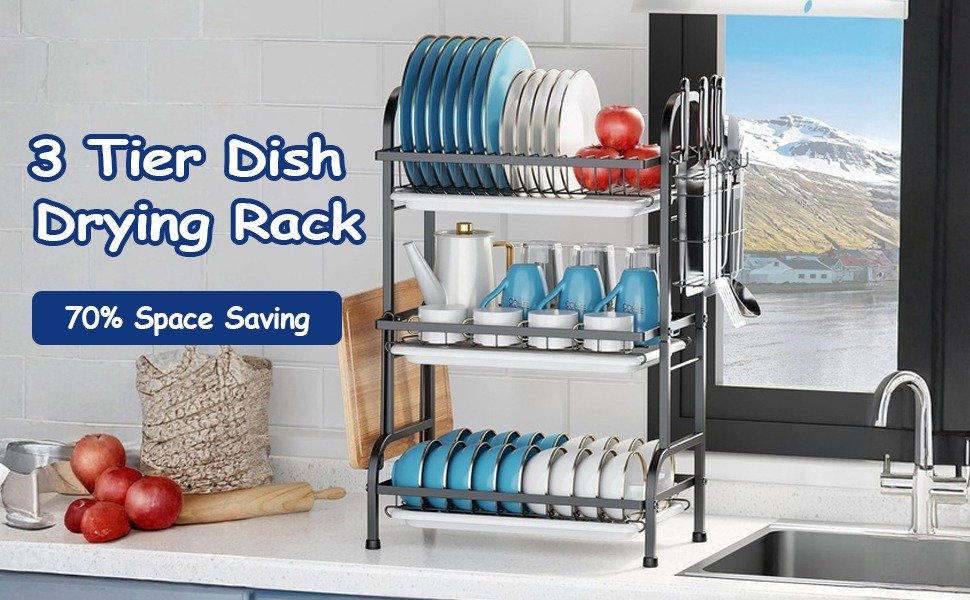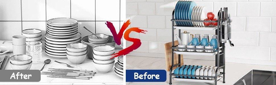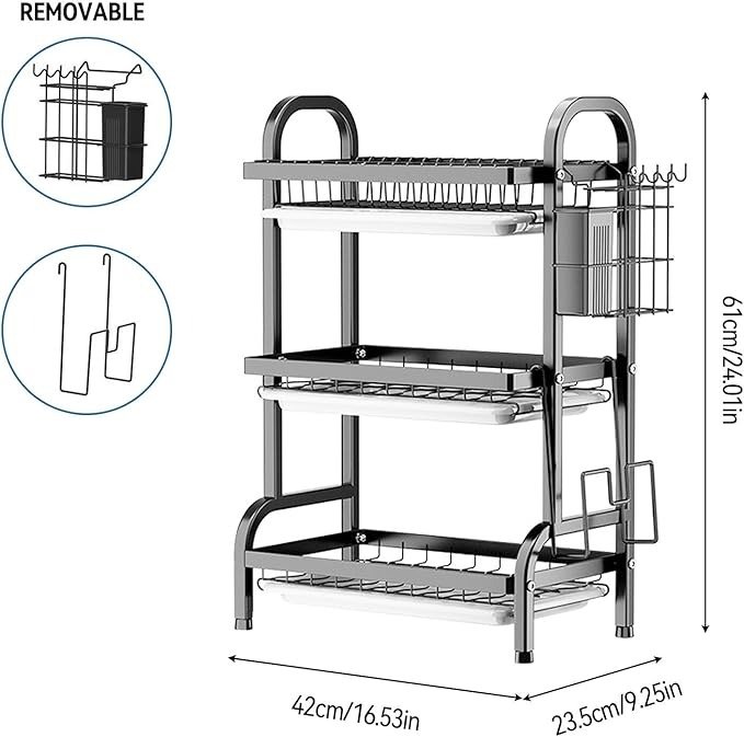 - Easy to Clean: Each tier of the kitchen dishes drying rack is equipped with a removable plastic tray that collects water and prevents countertop mess. Simply remove and empty the trays, no more rewetting dried dishes or scrubbing countertops (Dishwasher safe)