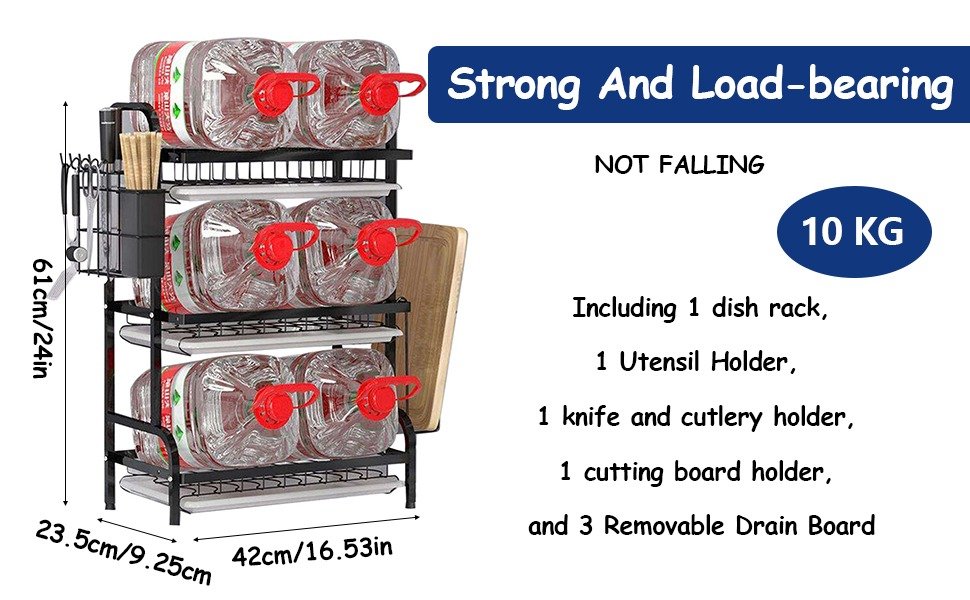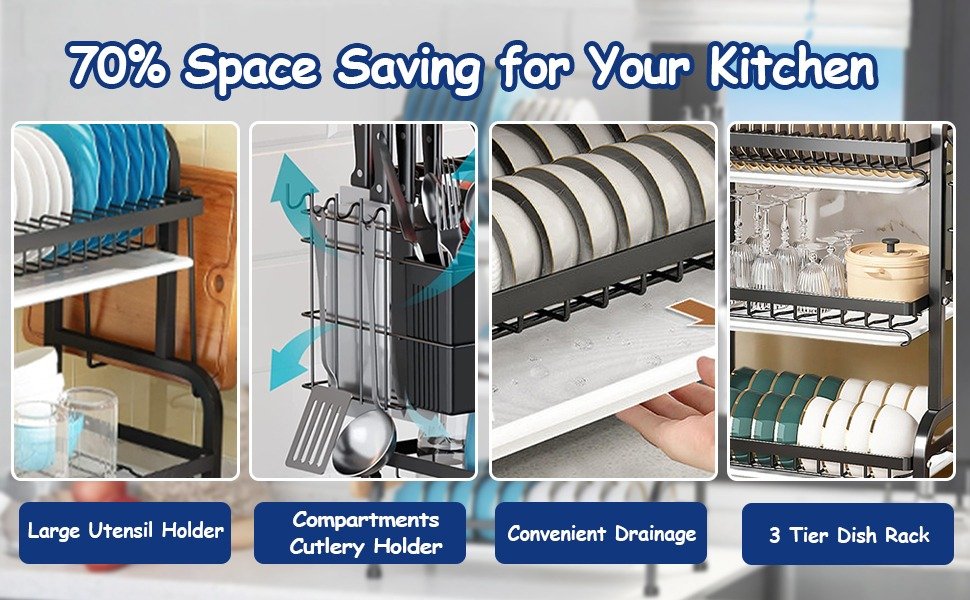 - Large Capacity: This over the sink dish rack includes 1 dish rack, 1 Utensil Holder, 1 knife and cutlery holder, 1 cutting board holder, and 3 removable drain board, holds up to 17 plates on the top tier, equipped with a dedicated knife rack, cutting board holder, and utensil storage rack,keeping everything orderly and accessible