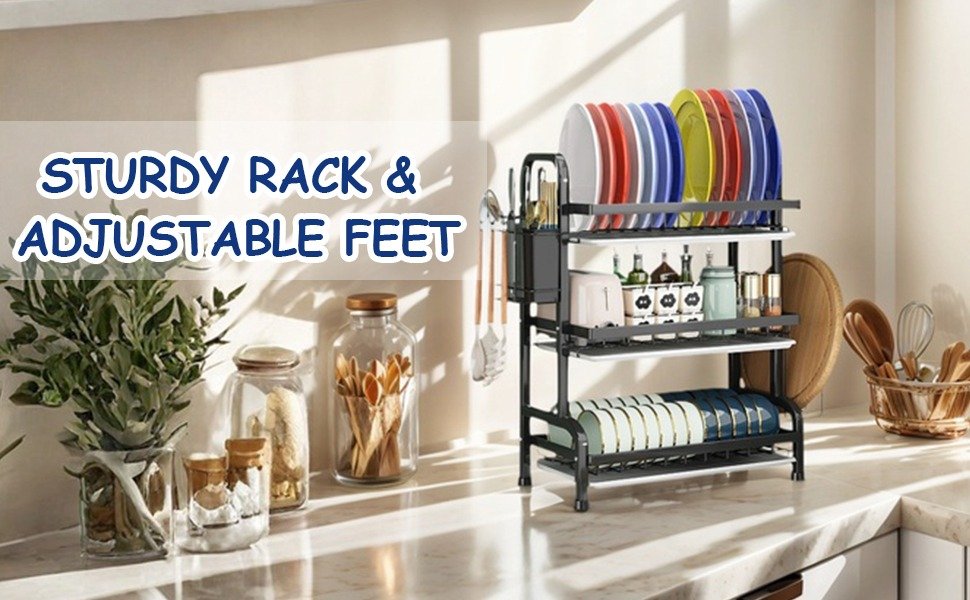 - Sturdy Iron Construction: The dish rack with drain tray made from heavy-duty iron with a black anti-rust finish, this rack supports up to 50 lbs. The reinforced legs and adjustable feet provide stability on uneven surfaces, ensuring long-term durability