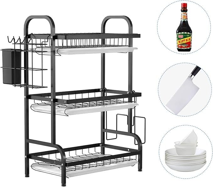 - 3-Tier Vertical Design: Measuring 16.5″ L x 9.8″ W x 24.8″ H, this dish drying rack utilizes vertical space efficiently, making it ideal for small kitchens or crowded countertops. The slim profile fits neatly under most cabinets while providing ample drying room for families